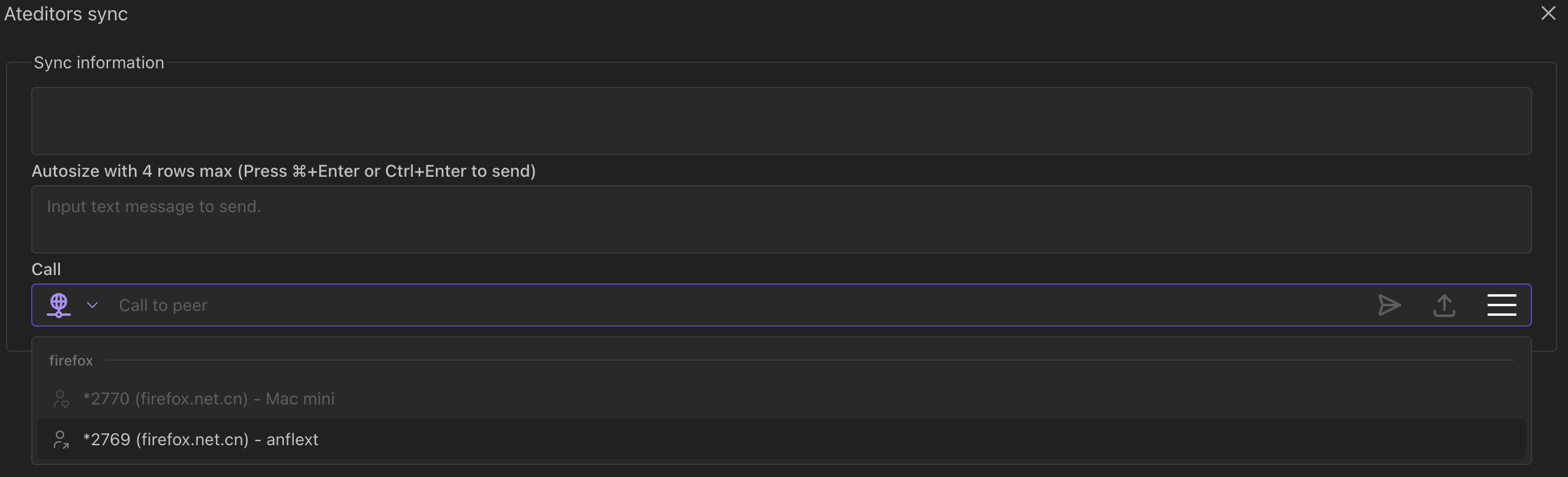 eyJpY2UiOnsidXJsIjoic3R1bjphbmZsZXh0LmNvbTo1MTIxNSJ9LCJsYWJlbCI6InRlc3QiLCJzaWduYWxpbmciOnsiZ3JvdXAiOiJmaXJlZm94IiwidXJsIjoid3NzOi8vYW5mbGV4dC5jb206NTEyMTcifSwic3NpciI6IjdCT09PWXNUN0VvTE4tY05VSUlZdTZUcFNOQ3ZWVFZtZ2dCSE5DeVY0Tjd6dE1VOXJ4TlJYeWl2LUJtZTlBMzg3WHljYUNSU1d0RWRKNXRBUlY3UFkxZkhEYlV3UW9sNVBLZXg0WHo0anZ4QnRxRGNmSlFDVEh2RnhDWmprdGc0bk9qWGhOdkxjN252cjIwdWtFeFBhWkFhVFhsYjFpVGlLV0RCekZZQzZJTXVHVTVQOXo0MVdaSF83SVZLRFZjWkJfalhDRjVzMmxIQnNDNEZRVUxLbjcyTDVGTmJjZlRGUmxhalFDc0o1eVBtM2pBSnVLTHAtVERLM0UyQmh3by1jUUN5UWd5ME1UdDIxN0YwWW16T3RmWEd4SlgxcC1GTW1CcmctcEFXbFp1ZnBnQld4c0hVUmZSeXAtNTZuMmN0VXl6Z2lrQkZRQ0dhQnUxc0ZEZnowaHVyd0EifQ粘贴以上 coder 到 ateditors 实时通信功能 option 的 code 字段,点击 Apply coder 按钮解码填充参数字段。