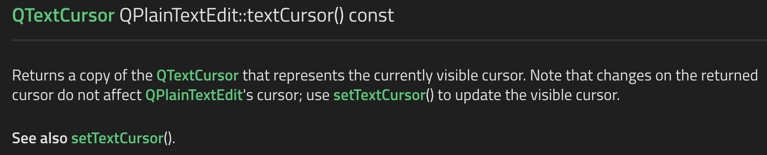在仔细阅读了相关 QT QPlainTextEdit::textCursor 文档后。发现一个说明,获取到的 textCursor 是一份新的拷贝,在修改了光标的属性后,需要使用 setTextCursor 函数更新当前 QPlainTextEdit 的 textCursor。